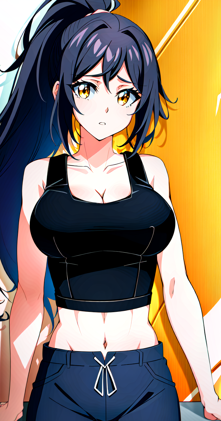 唐旋,1girl,独奏,乳房,长发,短裤,乳沟,白底,全身,黄眼睛,篮球,简单背景,中腹,巨乳,肚脐,运动鞋,马尾辫,高马尾,鞋子,看着观众,袜子、黑发、站立、运动胸罩、很长的头发、腕带