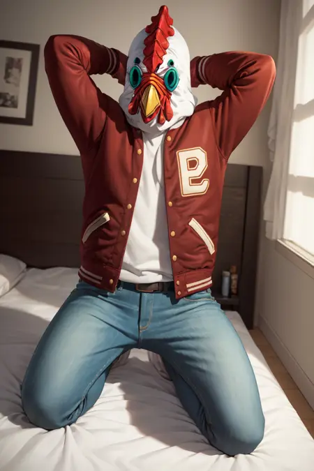 彼の服装には「JacketHotlineMiami, mask, letterman jacket, jeans」を使用してください。