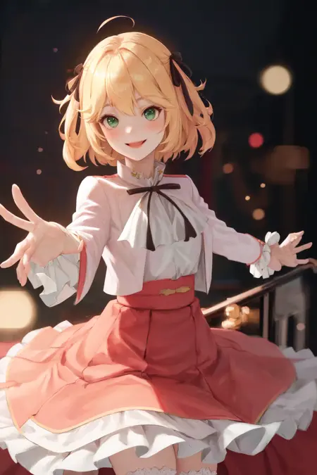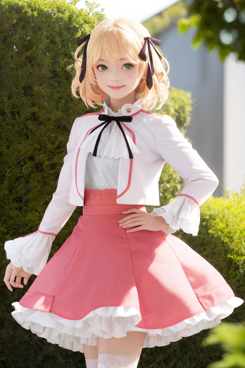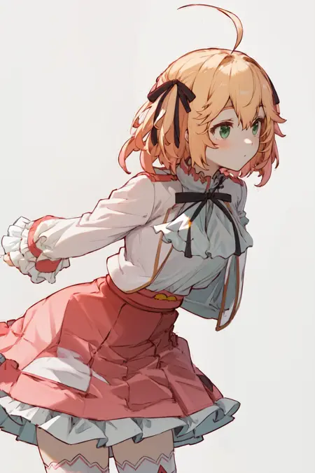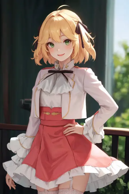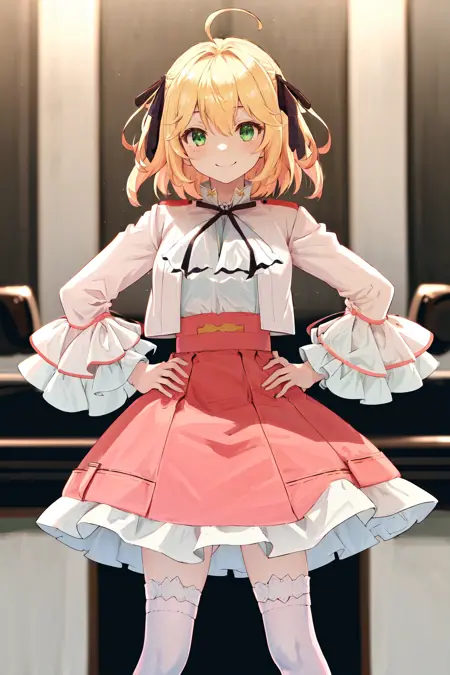 デフォルトの服装:ピンクスカート、フリルスカート、白ジャケット、カーポットジャケット、白シャツ、白太ももハイズ、フリル、黒リボンネックリボン、黒リボン、広い袖