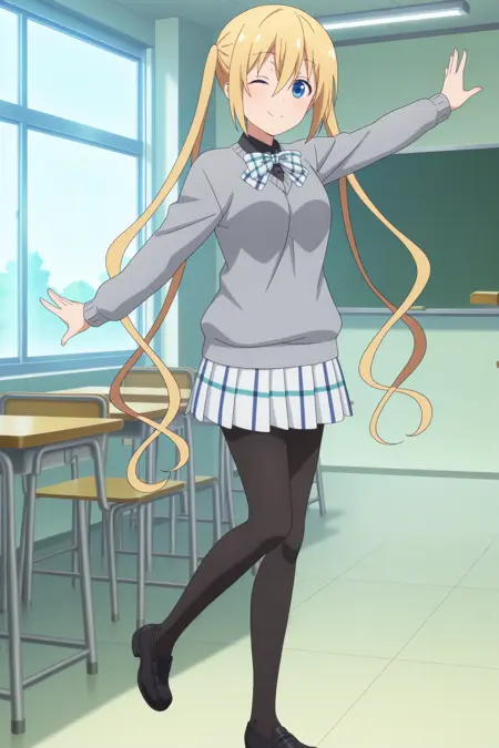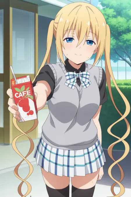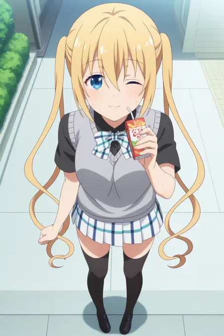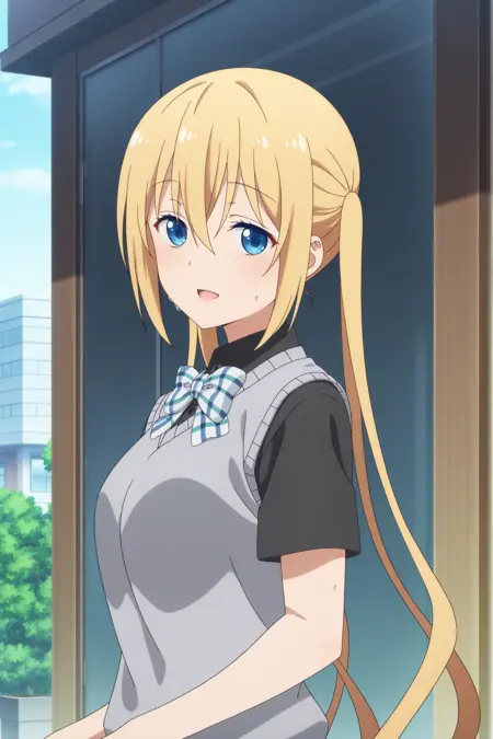 hinata kaho, 長い髪, 金髪, 四つ編み, 横髪, 目の間の髪, 青い目, 短い袖, グレーのセーターベスト, 黒いシャツ, ポロシャツ, 白いリボン, チェック模様のリボン, 白いスカート, チェック模様のスカート, プリーツスカート, 黒いハイソックス, 黒い靴, ローファー