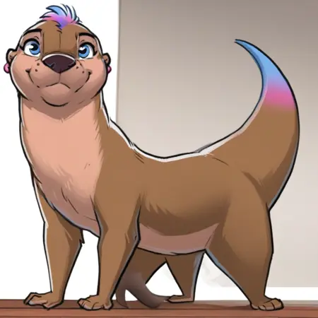 Otter, brown fur, tan belly, thick tail, colored tail tip, multicolored hair, blue eyes, pink earring,