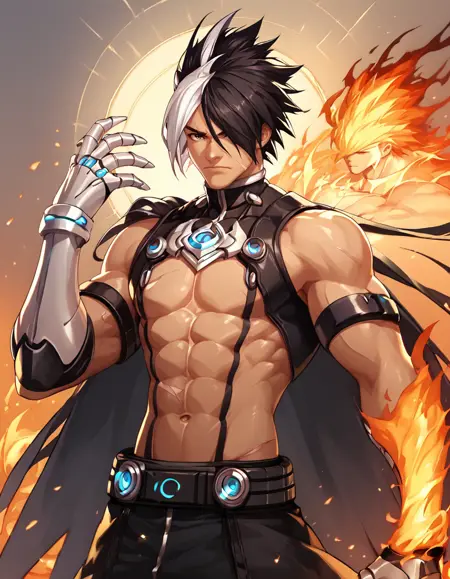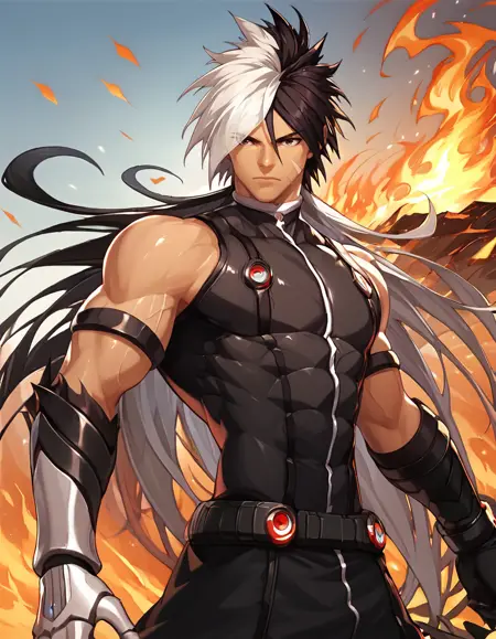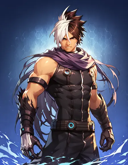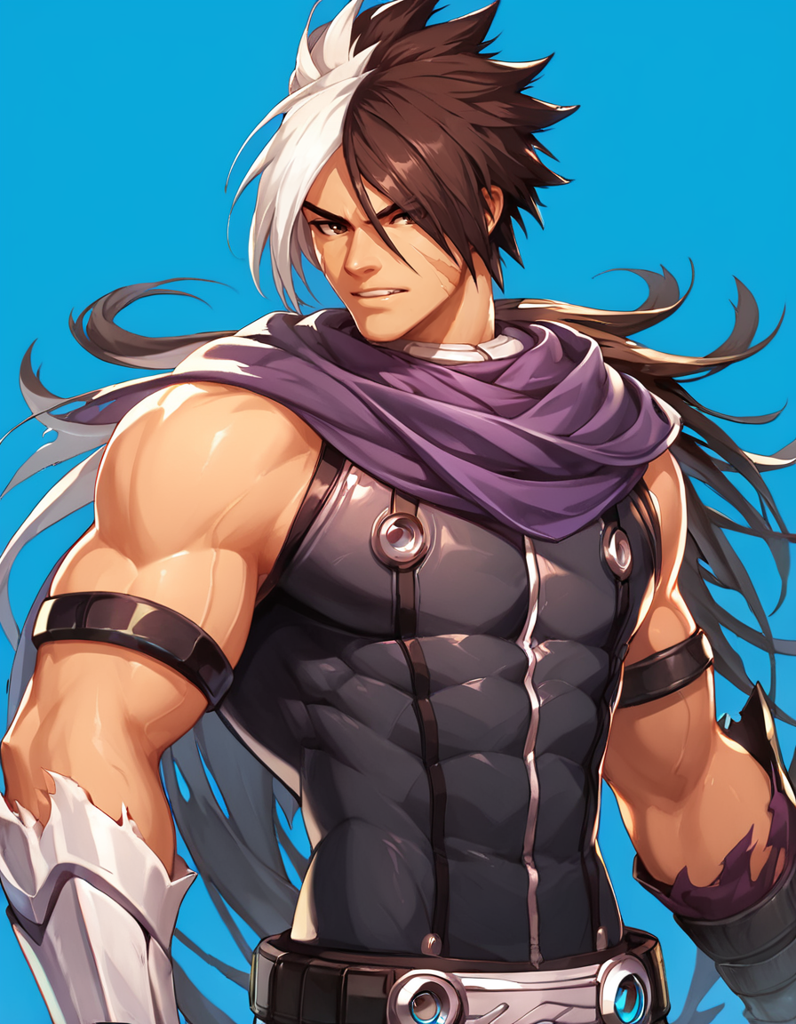 태그: Nameless_KOF, 단독, 갈색 머리카락, 검은 머리카락, 남자 아동, 흰색 머리카락, 남성 중심, 다색 머리카락, 벨트, 스카프, 한쪽 눈 위의 머리카락, 이색 머리카락, 찢어진 옷, 근육질, 흉터, 발톱, 얼굴 흉터, 보라색 스카프