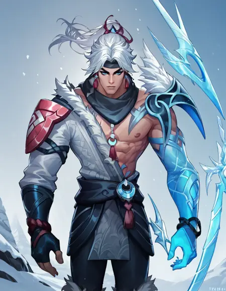 태그: Snow_Moon_Varus, 싱글, 앞머리, 파란 눈, 장갑, 남자 한 명, 보석, 서 있는 자세, 재킷, 말풀이, 흰 머리, 남성 중심, 귀걸이, 대체 복장, 바지, 손가락 없는 장갑, 갑옷, 공식 대체 복장, 털 장식, 근육질, 빛나는, 검은 바지, 근육질 남성, 어깨 갑옷