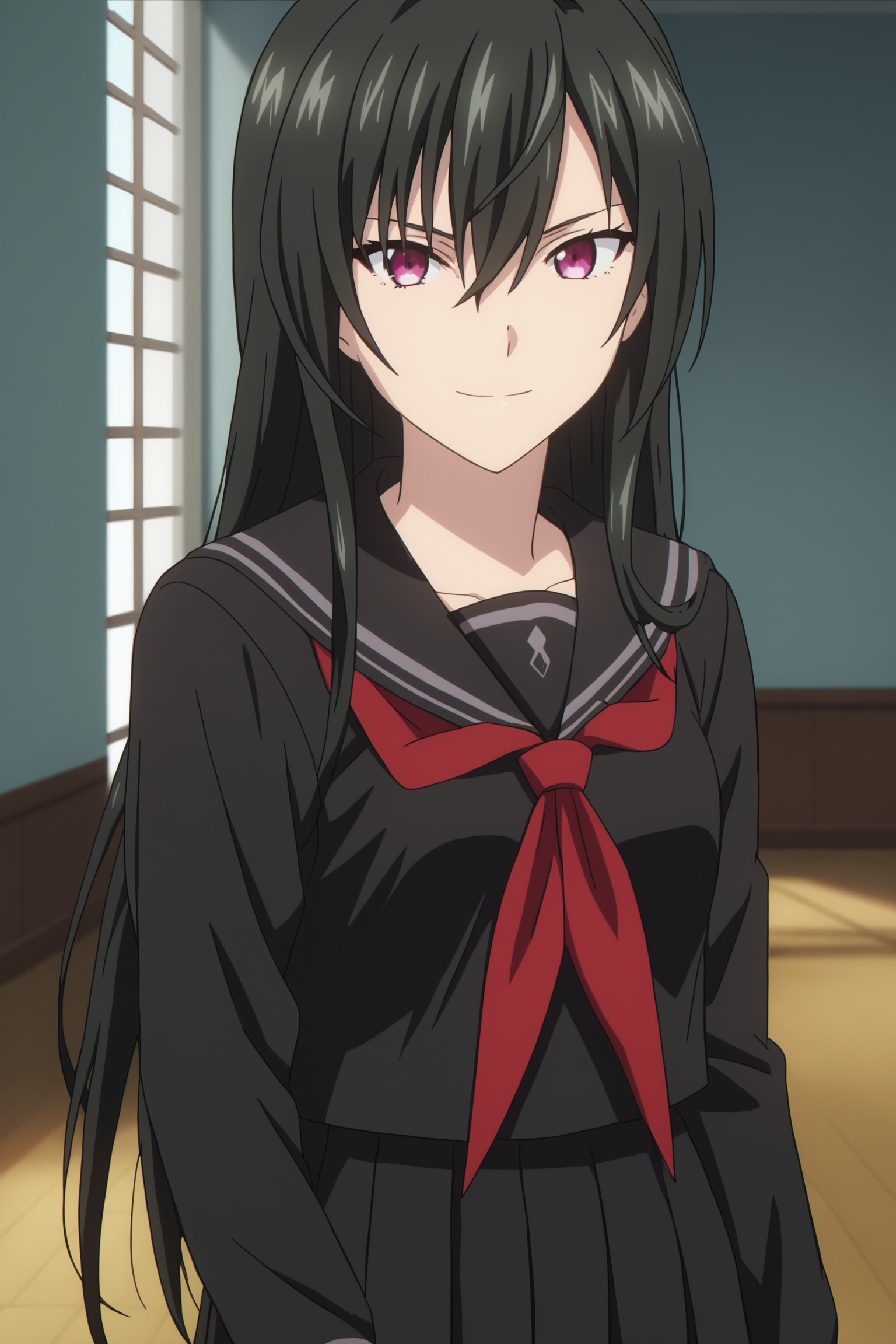 1girl, solo, long hair, bangs, black hair, hair between eyes, purple eyes, kiriha_kisaki