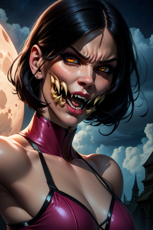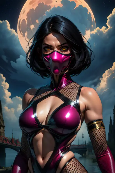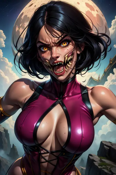 Mileena, 검은 머리, 중간 길이 머리, 노란 눈, 수직동공, 빛나는 눈
