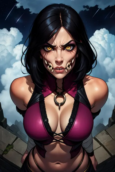 Mileena, black hair, medium hair, yellow eyes, slit pupils,- glowing eyes