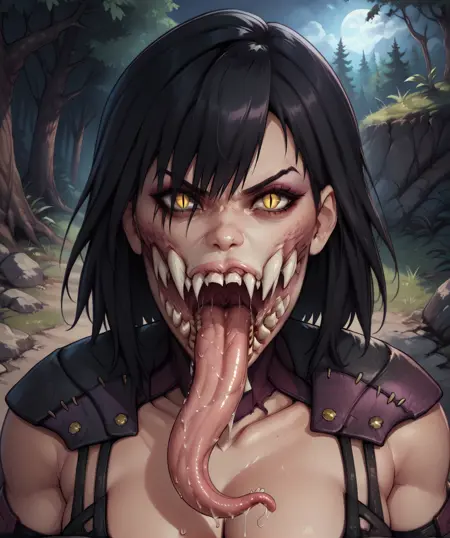 Mileena, black hair, medium hair, yellow eyes, slit pupils,- glowing eyes