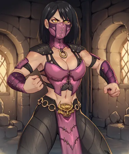 mouth mask, pink top, navel, cleavage, o-ring, stitched, leather armor, tight black pants, - sash, or pelvic curtain,