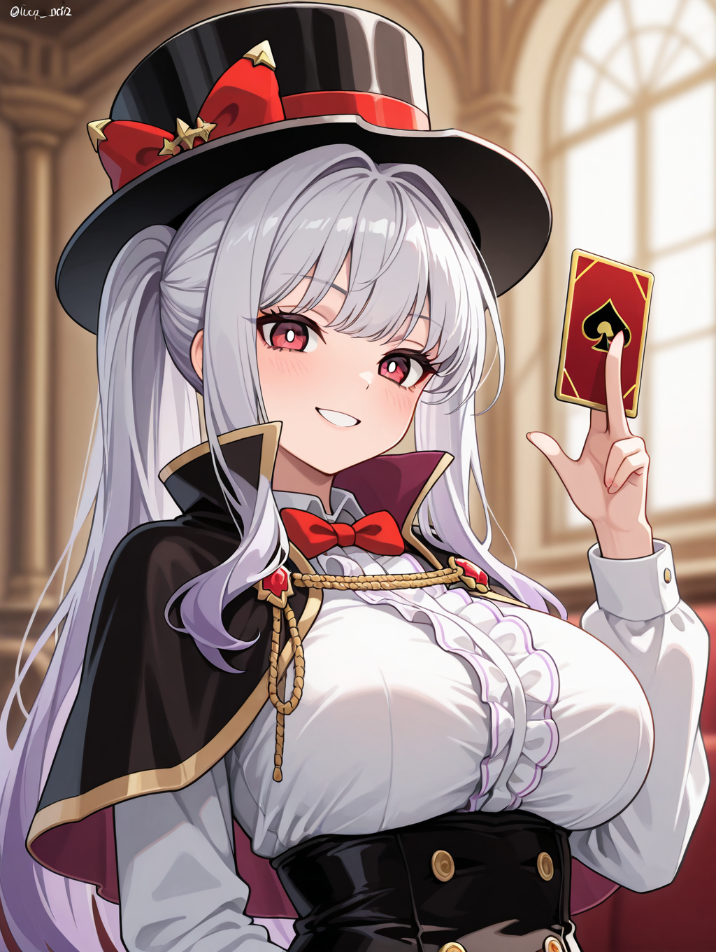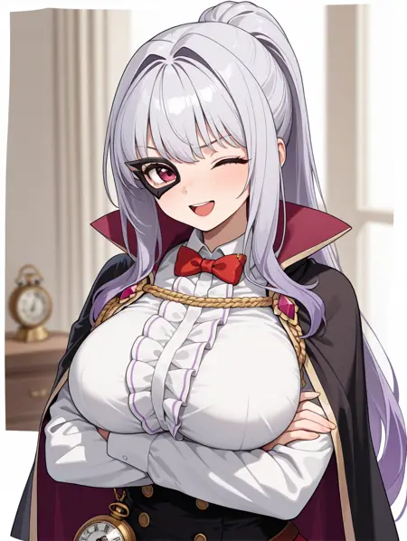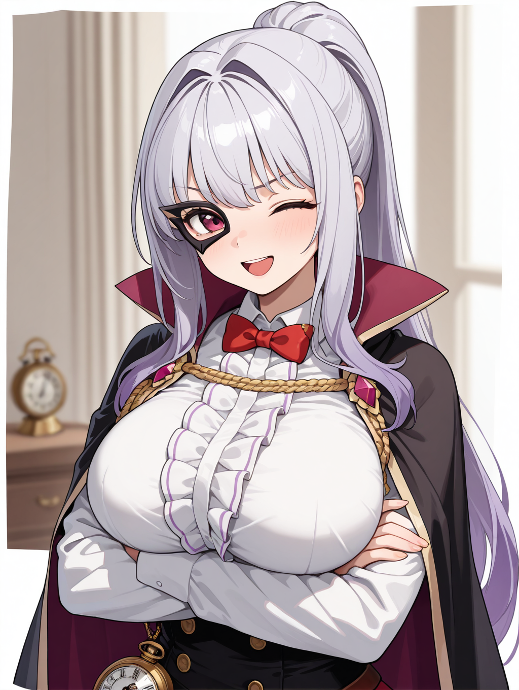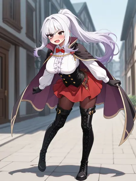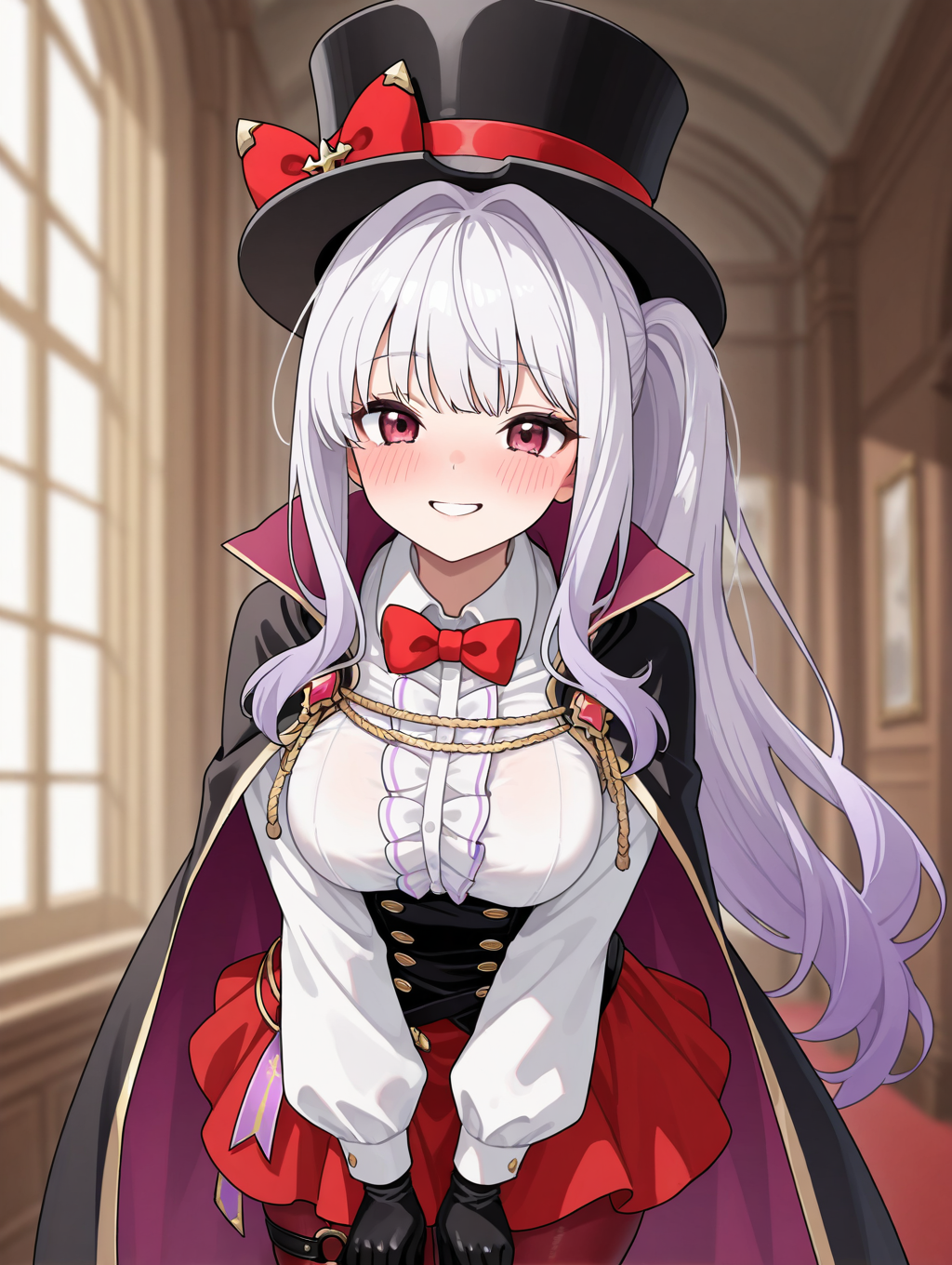 lucy, 1girl, solo, 長い髪, スカート, 大きな胸, シャツ, 脚長靴下, 手袋, リボン, 白いシャツ, ポニーテール, 白い髪, パンティーレッグ, ブーツ, 黒い手袋, ボウタイ, ケープ, 黒い靴, 赤いリボン, 赤いスカート, 目隠し, 赤いボウタイ, コルセット, 黒いケープ, 交差リボン靴, 太ももブーツ