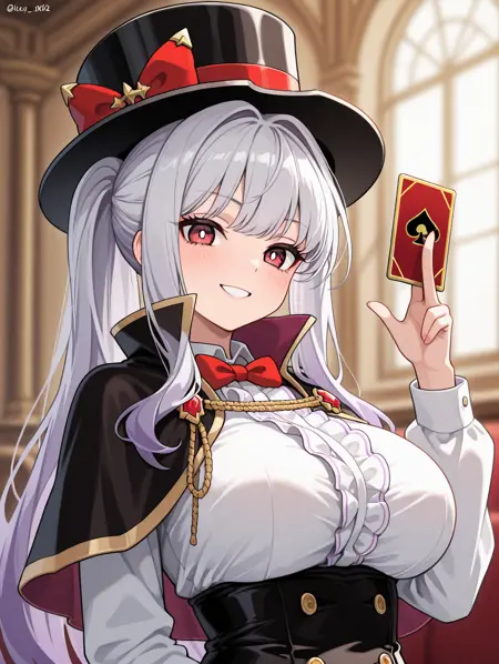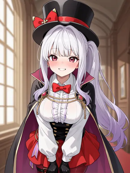 lucy, 1girl, solo, long hair, skirt, large breasts, shirt, thighhighs, gloves, bow, white shirt, ponytail, white hair, pantyhose, boots, black gloves, bowtie, cape, black footwear, red bow, red skirt, eyepatch, red bowtie, corset, black cape, cross-laced footwear, thigh boots