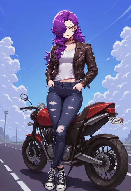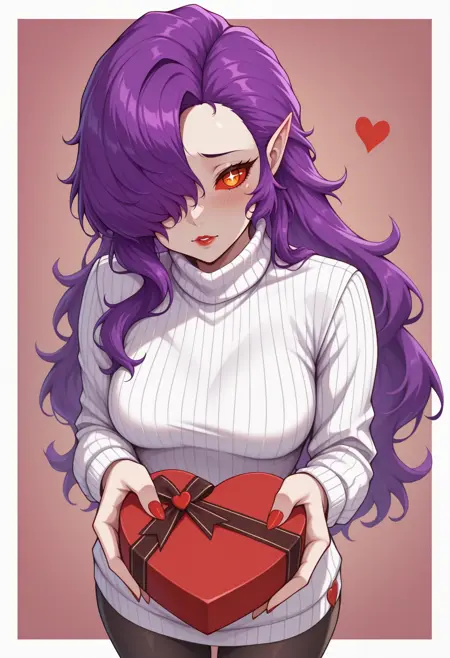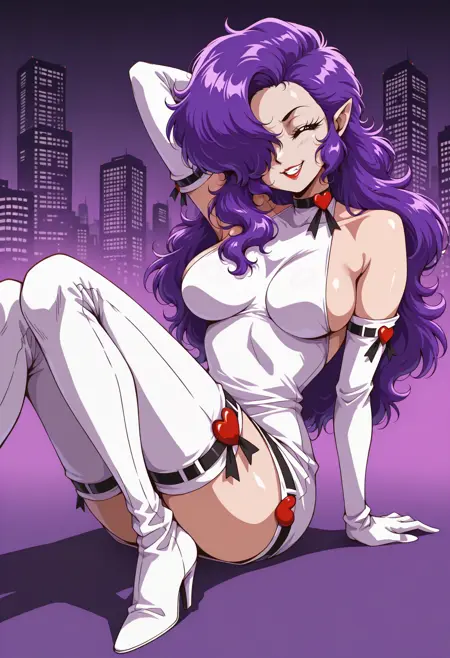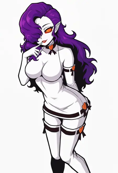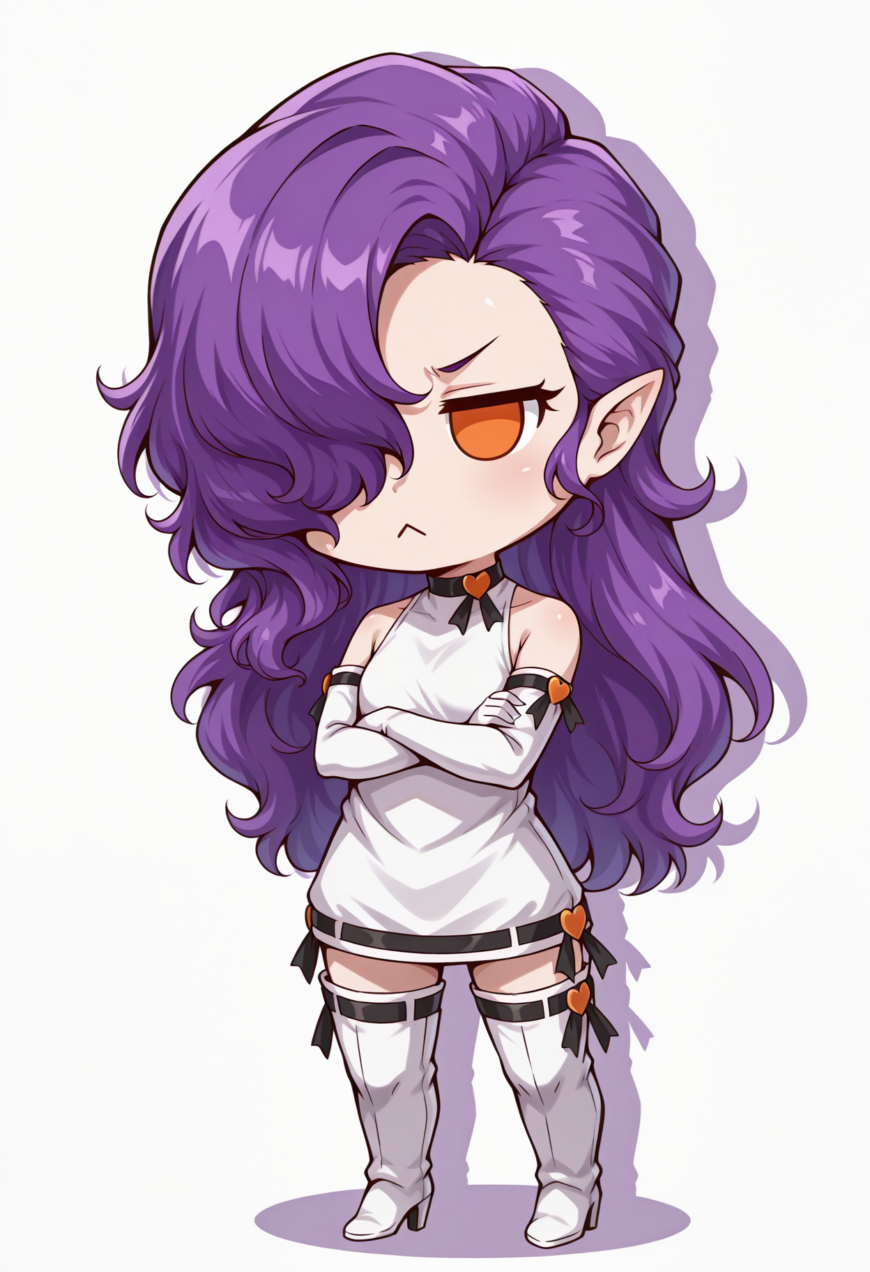 Default appearance: mnetr, purple hair, long hair, hair over one eye, orange eyes, red sclera, red lips, pointy ears, heart choker, white dress, medium breasts, sleeveless dress, white gloves, elbow gloves, short dress, ribbon trim, black ribbon, impossible clothes, thigh boots, white footwear, high heel boots