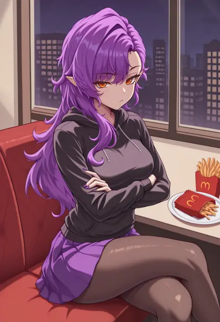 カスタム衣装: mnetr、紫髪、長髪、片目に髪をかけた、オレンジ色の目、赤い眼球、尖った耳