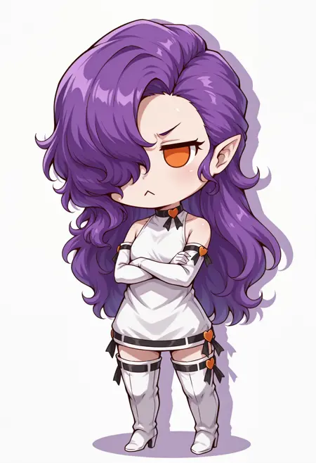デフォルトの外見: mnetr、紫髪、長髪、片目に髪をかけた、オレンジ色の目、赤い眼球、赤い唇、尖った耳、ハート型の首飾り、白いドレス、中程度の胸、ノースリーブのドレス、白い手袋、肘までの手袋、短いドレス、リボンのトリム、黒いリボン、非現実的な衣装、太ももブーツ、白い靴、ハイヒールブーツ