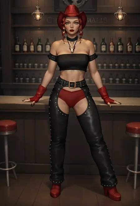 cgrayne, 红发, 红色卷发, 绿色眼睛, 红色口红, 牛仔服装, 项链, 牛头骨吊坠, 红色牛仔帽, 黑色露脐上衣, 红色无指手套, 露腹, 腰带, 上臂黑色皮带, 黑色马裤, 红色内裤, 红色牛仔靴