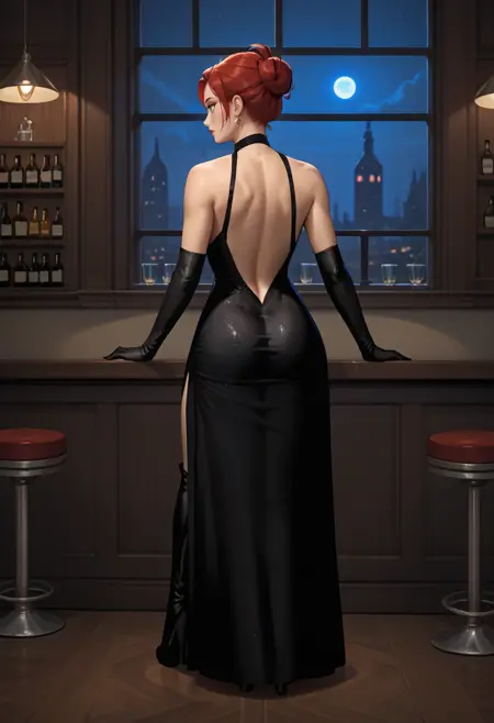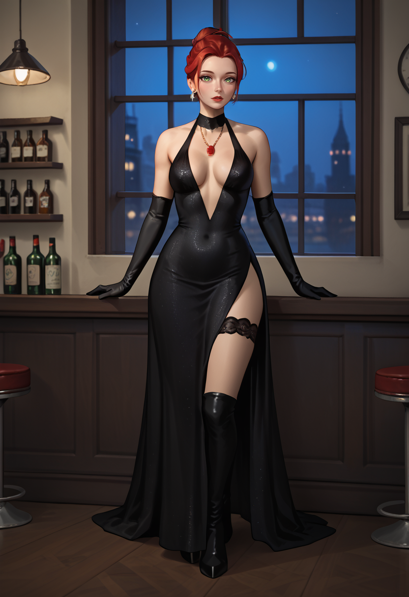 raynedress, 红发, 发髻, 耳环, 绿色眼睛, 晚礼服, 黑色礼服, 红色吊坠, 肘部手套, 大腿长靴