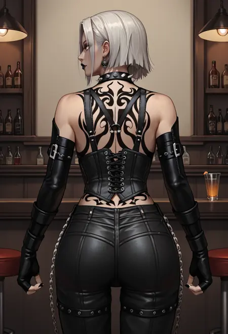 darkrayne, 白发, 白色眼睛, 短发, 黑色口红, 带刺项圈, 纹身, 哥特风格, 皮革, 胸衣, 无指肘套, 裤子, 链条, 靴子