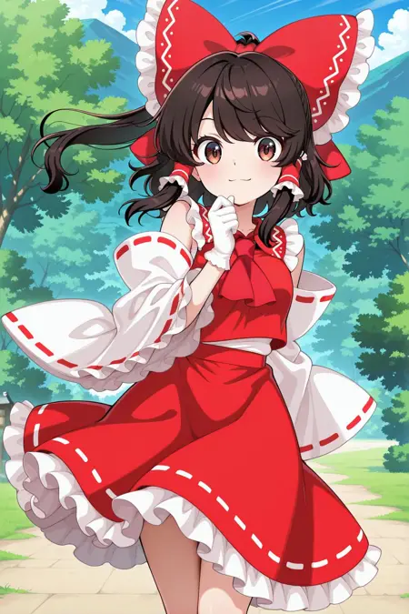 hakurei reimu, 1girl, solo, brown eyes, black hair, medium hair, ponytail, swept bangs,, hakurei reimu \(cherry-blossom-spirit\), hair bow, red bow, red vest, red ascot, white shirt, detached sleeves, wide sleeves, frilled sleeves, ribbon-trimmed sleeves, white gloves, red skirt, frilled skirt,