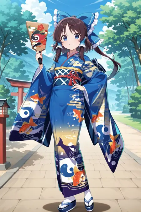 hakurei reimu, 1girl, solo, blue eyes, black hair, long hair, sidelocks, loose hair strand, ponytail, small breasts, henohenomoheji,, hakurei reimu \(new year god-summoning shaman\), alternate costume, hair bow, blue bow, frilled bow, hair tubes, blue tubes, blue kimono, furisode, long sleeves, wide sleeves, fish print, yin yang print, blue obi, yellow obiage, red haneri, blue sash, white socks, platform sandals,