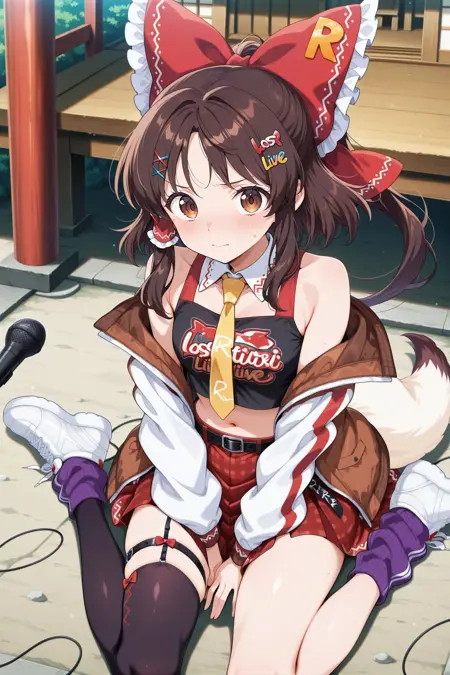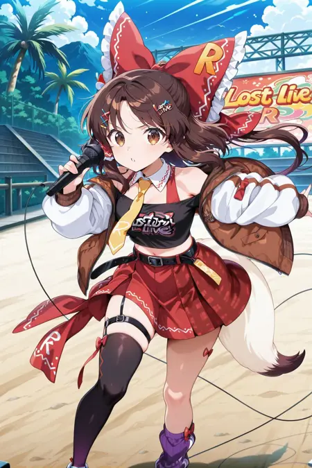 hakurei reimu, 1girl, solo, brown eyes, brown hair, long hair, sidelocks, ponytail, small breasts, hakurei reimu \(lostword live 2024\), alternate costume, hair bow, single hair tube, hair ornament, hairclip, x hair ornament, "r" bow clip, r letter, detached collar, black shirt, clothes writing, crop top, bare shoulders, open jacket, brown jacket, long sleeves, white sleeves, yellow necktie, midriff, miniskirt, red skirt, plaid skirt, black belt, fox tail, garter straps, single thighhigh, black thighhighs, mismatched legwear, uneven legwear, leg warmers, purple socks, white footwear, sneakers, holding microphone,