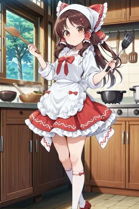 alternate costume, reimu-lcook, hakurei reimu \(shrine maiden of rice and miso soup\), adapted costume, kitchen apron, white kitchen apron, gloves, white gloves, white socks, hair ornament, frills, detached sleeves, head scarf, white head scarf, hairclip, kneehighs, hair tubes,