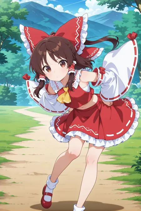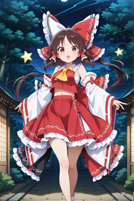 hakurei reimu, 1girl, solo, brown eyes, brown hair, long hair, sidelocks, ponytail, small breasts, hakurei reimu \(karma speed\), adapted costume, hair bow, white bow, red bow, frilled bow, star symbol, hair tubes, yellow ascot, red shirt, ribbon-trimmed sleeves, detached sleeves, wide sleeves, chest sarashi, navel, red skirt, frilled skirt, back bow, black bow, red bow, white socks, ankle socks, mary janes, red shoes,