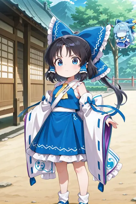 hakurei reimu, 1girl, solo, blue eyes, black hair, long hair, sidelocks, loose hair strand, ponytail, small breasts, aged down,, hakurei reimu \(god-summoning priestess\), hair bow, blue bow, frilled bow, hair tubes, blue tubes, shoulder sash, white sash, character name, yellow ascot, blue shirt, ribbon-trimmed sleeves, detached sleeves, wide sleeves, chest sarashi, blue skirt, frilled skirt, white socks, ankle socks, mary janes, blue shoes,