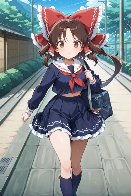 alternate costume, reimu-student, skirt, short sleeves, pleated skirt, hair bow, hair tubes, blue skirt, navel, red bow, school uniform, blue shirt, sailor collar, serafuku, shirt, holding, midriff, neckerchief, red neckerchief, frilled bow, frills, bag,