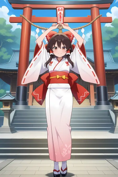 복장 변경, reimu-l1, 하쿠레이 레imu \(행운의 신사의 신녀\), 복장 변경, 리본, 갈색 눈, 갈색 머리, 프릴 리본, 프릴, 게타, 고헤이, 머리 리본, 일본 복장, 키모노, 긴 소매, 오비, 오후다, 빨간 리본, 빨간 띠, 띠, 시데, 타비, 흰 키모노, 넓은 소매,