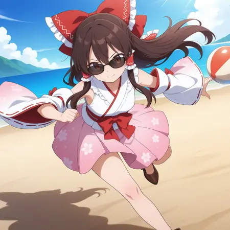 하쿠레이 레imu, 1소녀, 혼자, 갈색 눈, 갈색 머리, 긴 머리, 옆머리, 작은 가슴, 하쿠레이 레imu \(천국의 여유로운 신녀\), 복장 변경, 머리 리본, 머리 튜브, 빨간 허리 리본, 흰 셔츠, 넓은 소매, 분리형 소매, 분홍 치마, 꽃무늬 치마, 선글라스, 머리 위 안경, 하이힐, 갈색 신발,