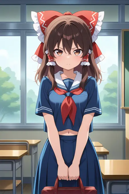 hakurei reimu, 1girl, solo, brown eyes, brown hair, long hair, sidelocks, ponytail, small breasts, hakurei reimu \(carefree class representative\), alternate costume, hair bow, hair tubes, red neckerchief, school uniform, blue shirt, sailor collar, serafuku, long sleeves, midriff, blue skirt, pleated skirt, frilled skirt, blue socks, kneehighs, brown shoes, school bag, holding bag,