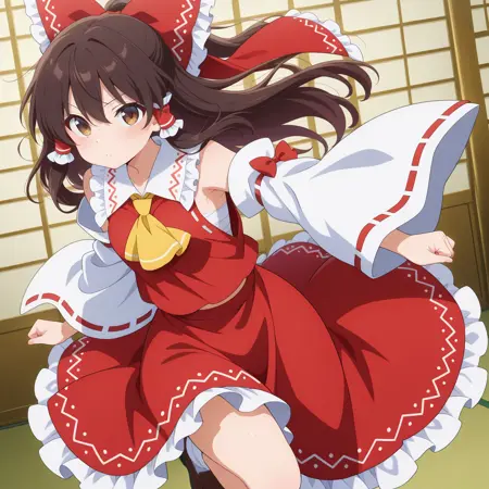 hakurei reimu, 1girl, solo, brown eyes, brown hair, long hair, sidelocks, small breasts,