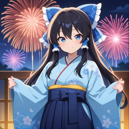 하쿠레이 레imu, 1소녀, 혼자, 파란 눈, 검은 머리, 긴 머리, 옆머리, 작은 가슴, 복장 변경, 머리 리본, 머리 튜브, 파란 리본, 파란 튜브, 프릴 리본, 파란 키모노, 긴 소매, 넓은 소매, 일본 복장, 꽃무늬, 파란 오비, 노랑 오비아게, 빨간 하네리, 설날, 파란 띠, 하네(하네츠키) 들고 있음,