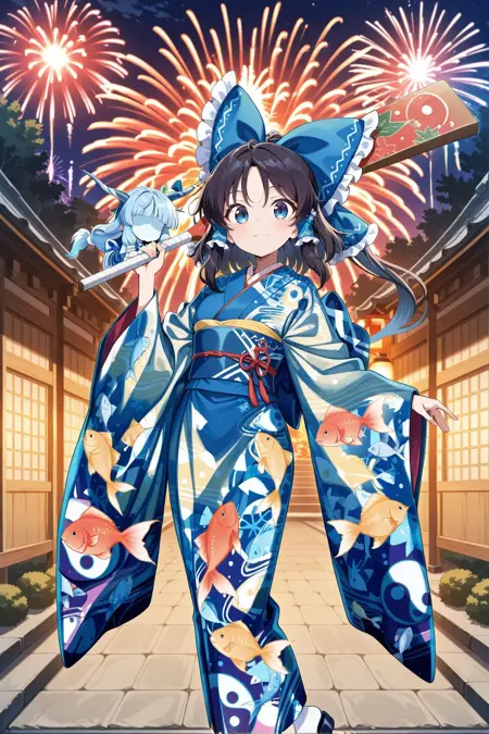hakurei reimu, 1girl, solo, blue eyes, black hair, long hair, sidelocks, loose hair strand, ponytail, small breasts, henohenomoheji,, hakurei reimu \(new year god-summoning shaman\), alternate costume, hair bow, blue bow, frilled bow, hair tubes, blue tubes, blue kimono, furisode, long sleeves, wide sleeves, fish print, yin yang print, blue obi, yellow obiage, red haneri, blue sash, white socks, platform sandals,
