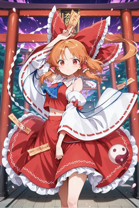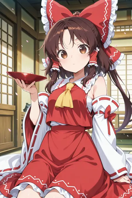 hakurei reimu, 1girl, solo, brown eyes, black hair, medium hair, ponytail, swept bangs,, hakurei reimu \(cherry-blossom-spirit\), hair bow, red bow, red vest, red ascot, white shirt, detached sleeves, wide sleeves, frilled sleeves, ribbon-trimmed sleeves, white gloves, red skirt, frilled skirt,
