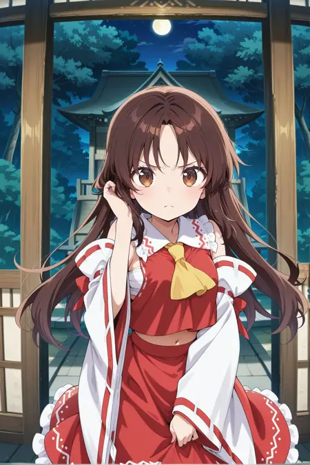 hakurei reimu, 1girl, solo, brown eyes, brown hair, long hair, sidelocks, small breasts,