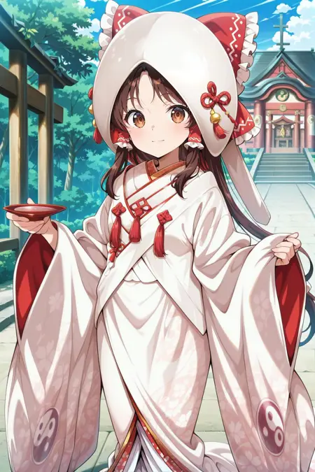 hakurei reimu, 1girl, solo, brown eyes, brown hair, long hair, sidelocks, ponytail, small breasts, hakurei reimu \(sacred white shrine maiden\), hair bow, frilled bow, frilled hair tubes, hood up, shiromuku, uchikake, white kimono, long sleeves, wide sleeves, print kimono, yin yang print, tabi, holding cup,