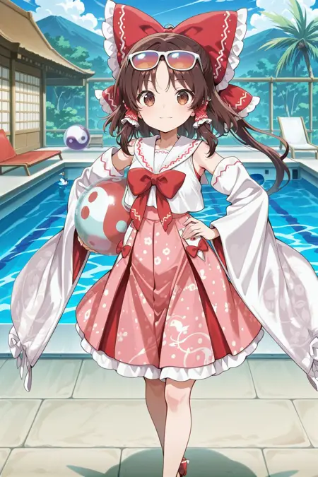 hakurei reimu, 1girl, solo, brown eyes, brown hair, long hair, sidelocks, ponytail, small breasts, hakurei reimu \(leisurely shrine maiden of paradise\), alternate costume, hair bow, hair tubes, sunglasses, eyewear on head, bikini, white shirt, wide sleeves, detached sleeves, red bowtie, pink skirt, floral print, high heels, brown sandals, footwear bow, beachball,