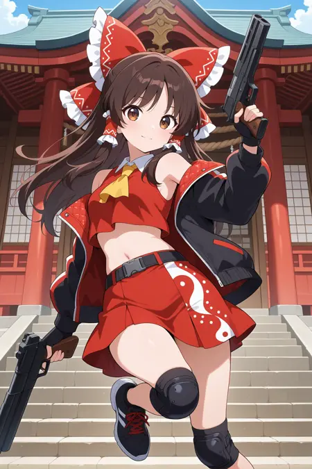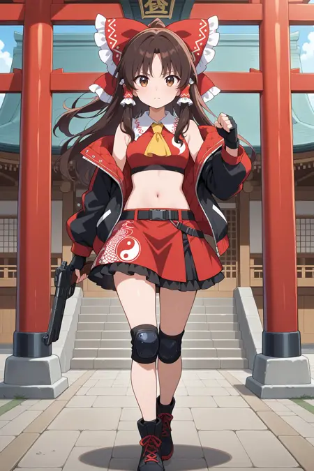alternate costume, reimu-b3, hakurei reimu \(lunar war shaman\), a-pose, adapted costume, ascot, black gloves, black sleeves, crop top, gloves, gun, midriff peek, navel, ponytail, red bow, red shirt, red skirt, shirt, black and red bow, weapon, red bow, gloves, bow, fingerless gloves, knee pads, skirt, hair tubes, hair bow, holding, red skirt, yellow ascot, jacket, navel, holding weapon, frills, holding gun, open clothes, frilled bow,
