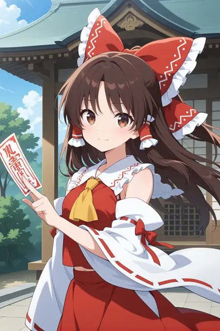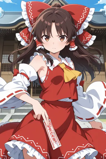 hakurei reimu, 1girl, long hair, brown hair, brown eyes, bangs, sidelocks, hair between eyes, small breasts,