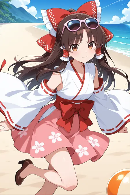 hakurei reimu, 1girl, solo, brown eyes, brown hair, long hair, sidelocks, ponytail, small breasts, hakurei reimu \(leisurely shrine maiden of paradise\), alternate costume, hair bow, hair tubes, sunglasses, eyewear on head, bikini, white shirt, wide sleeves, detached sleeves, red bowtie, pink skirt, floral print, high heels, brown sandals, footwear bow, beachball,
