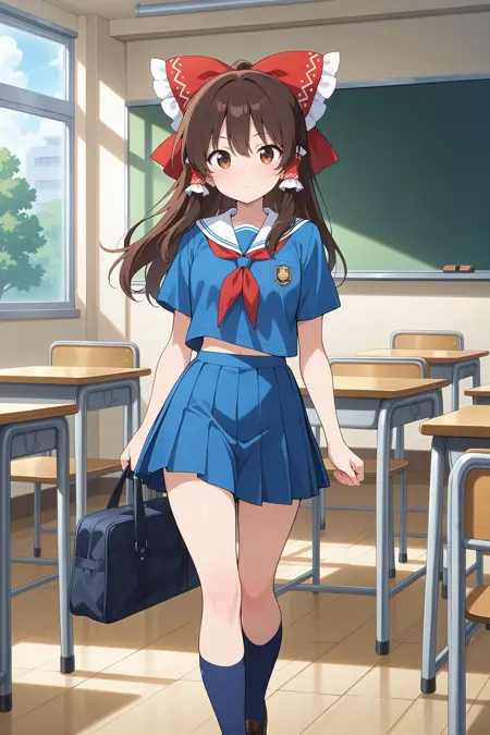 hakurei reimu, 1girl, solo, brown eyes, brown hair, long hair, sidelocks, small breasts, alternate costume, hair bow, hair tubes, school uniform, blue shirt, sailor collar, serafuku, short sleeves, red neckerchief, blue skirt, pleated skirt, midriff, blue socks, holding bag, brown shoes,