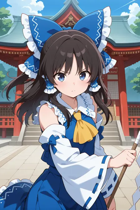 hakurei reimu, 1girl, solo, blue eyes, black hair, long hair, sidelocks, loose hair strand, ponytail, small breasts,
