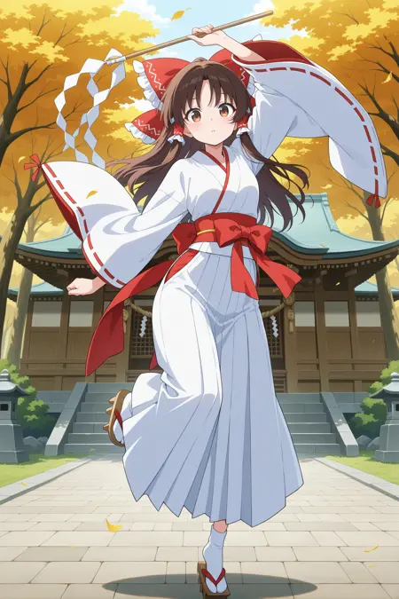 alternate costume, reimu-l1, hakurei reimu \(good luck shrine maiden\), alternate costume, bow, brown eyes, brown hair, frilled bow, frills, geta, gohei, hair bow, japanese clothes, kimono, long sleeves, obi, ofuda, red bow, red sash, sash, shide, tabi, white kimono, wide sleeves,