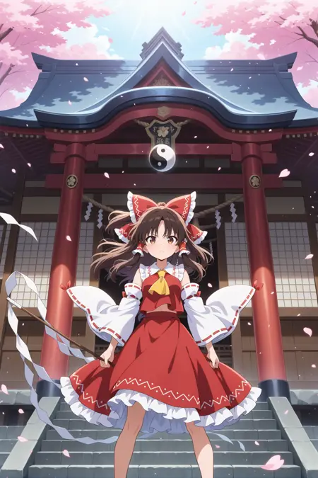hakurei reimu, 1girl, solo, brown eyes, black hair, long hair, ponytail, swept bangs,, hakurei reimu \(cherry blossom spirit\), hair bow, red bow, red vest, red ascot, white shirt, detached sleeves, wide sleeves, frilled sleeves, ribbon-trimmed sleeves, white gloves, red skirt, frilled skirt, gohei,