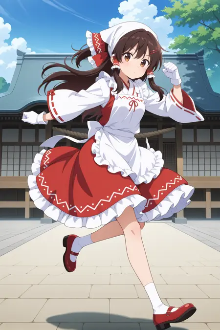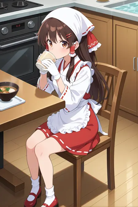 hakurei reimu, 1girl, solo, brown eyes, brown hair, long hair, sidelocks, small breasts, hakurei reimu \(shrine maiden of rice and miso soup\), alternate costume, white headscarf, hairclip, hair tubes, red skirt, kitchen apron, white kitchen apron, long sleeve kitchen apron, frilled apron, mary janes, white gloves, white socks, red shoes,