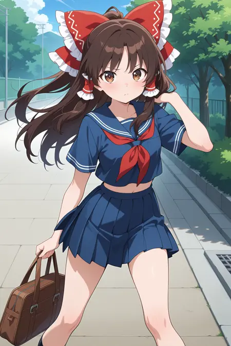 alternate costume, reimu-student, skirt, short sleeves, pleated skirt, hair bow, hair tubes, blue skirt, navel, red bow, school uniform, blue shirt, sailor collar, serafuku, shirt, holding, midriff, neckerchief, red neckerchief, frilled bow, frills, bag,