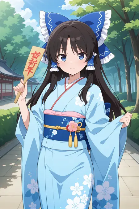 hakurei reimu, 1girl, solo, blue eyes, black hair, long hair, sidelocks, small breasts, alternate costume, hair bow, hair tubes, blue bow, blue tubes, frilled bow, blue kimono, long sleeves, wide sleeves, japanese clothes, flower print, blue obi, yellow obiage, red haneri, new year, blue sash, holding hane (hanetsuki),