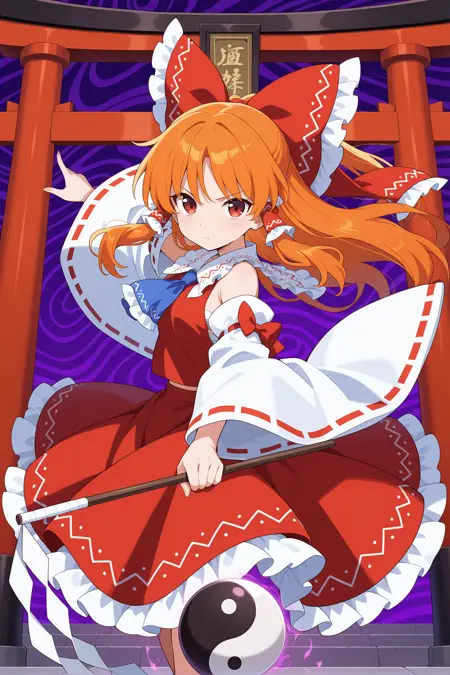 hakurei reimu, 1girl, solo, red eyes, blonde hair, orange hair, long hair, sidelocks, small breasts,, hair bow, hair tubes, frilled bow, blue ascot, red shirt, ribbon-trimmed detached wide sleeves, red skirt, holding gohei, yin yang orb,