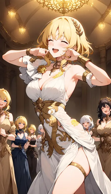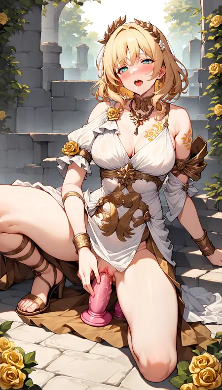 (best quality,8K, masterpiece :1.3),anime,Aglaea, none pupil, (green eyes:0.5), pure eyes, goddess, mature, white dress, white flower, golden flower ornament, straped dress, long skirt, white skirt, side slit, detached sleeves, gold trim, greek clothes, arm armor, brown armor, wristband, golden tattoo, medium breasts, (cleavage:0.6), necklace, bare shoulders, gold rose, pleated sleeves, short sleeves, single sleeve, (thigh strap:0.5)