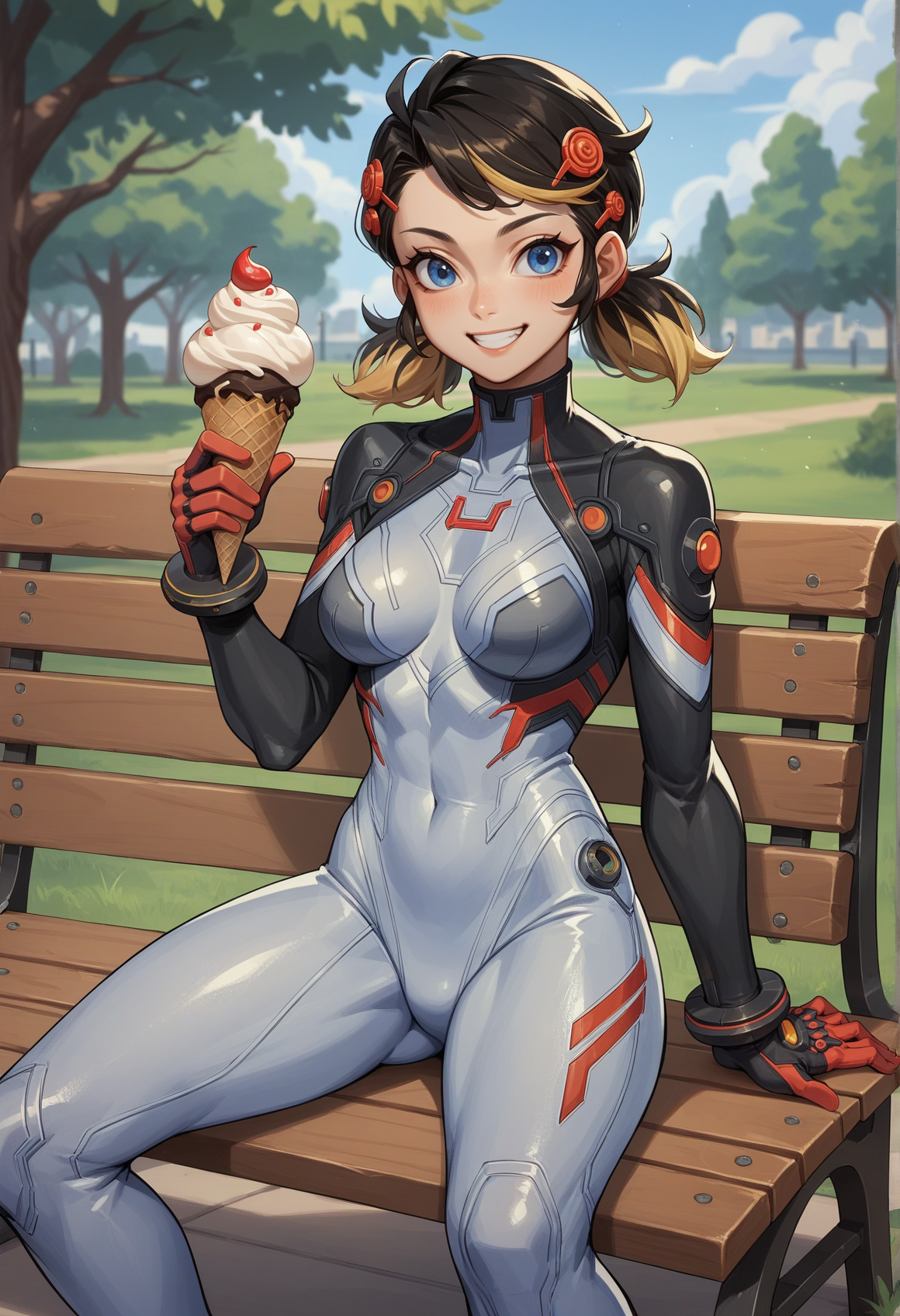 : 中程度の髪、青い目、多色の髪、低めのポニーテール、黒髪、金髪、髪飾り、ボディスーツ、フルボディスーツ